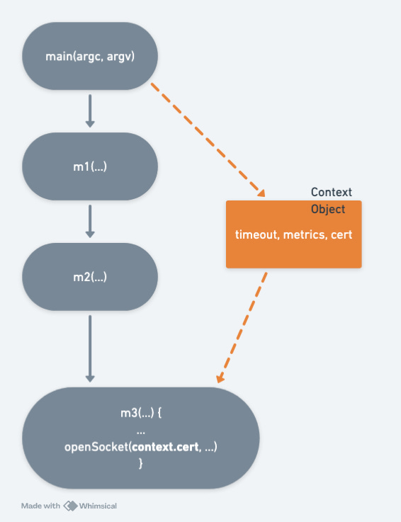 書中也舉了下圖的例子來解釋不同層做不同事的重要性。在下圖中,從 main 函數開始,要到了 m3 才會需要 cert 的變數。如果我們把 cert 一路沿著 mian 函數傳遞下去,那 cert 就會曝露在 m1, m2 這兩層不需要應用 cert 變數的抽象層裡,因而增加了無謂的「認知負荷」。此外,日後如果我們需要增加其它要傳遞給 m3 的變數時,也要一併修改 m1, m2 這兩層,這是典型的「變更放大」。也因此,比較好的設計,是設計一個 Context Object來傳遞這種需要跨層傳遞的變數,如此可以明確地分割清楚不同層的任務。