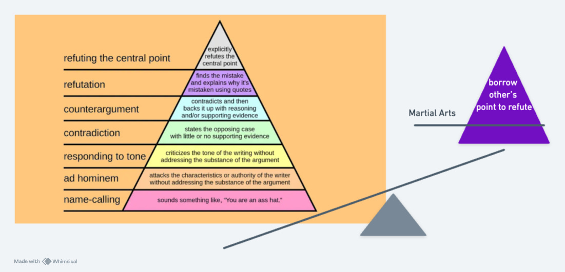 上圖的左邊是 Paul Graham 的 『How to disagree 金字塔』,我本來以為可以在金字塔的其中的一層找到 Martial Arts 的爭論技巧,結果找不到,只好把這個技巧畫在右邊。