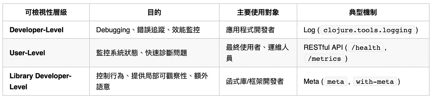 有一件事既矛盾又有趣:「可檢視性的重要性,往往會是對於某個系統不熟悉的人,感受特別強烈。」對於系統熟悉的人,無論怎麼開發,很自然地就會走到 happy path 之上,就算偶然因為粗心寫了錯誤,往往離 happy path 也不遠。真的要除錯時,也可以基於自己對系統的整體性理解,很快地猜出概略的方向。與之相對的,如果是某位要接手維護這個系統的人,系統的可檢視性就會非常的重要。