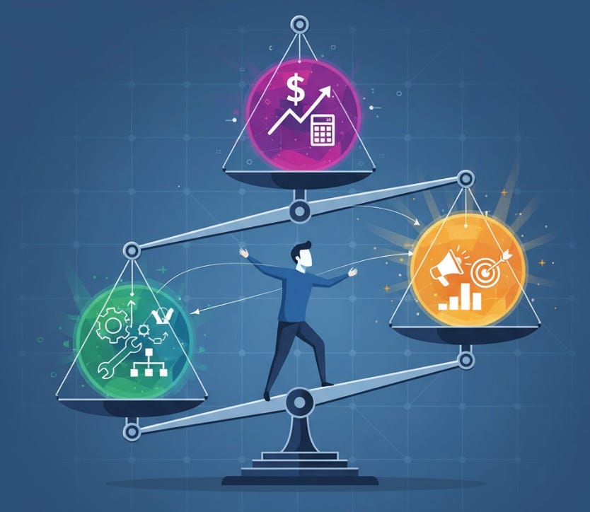 而總經理真正的工作挑戰就是要把來自不同職能、常常互相衝突的觀點,整理成一個可以被執行的整體方案,並對結果負最後責任。營運告訴你「怎麼做才可靠」,行銷/銷售告訴你「怎麼做才賣得出去」,財務告訴你「怎麼做才不會燒光現金」——總經理要在這三者之間做取捨,並承受選擇帶來的後果。