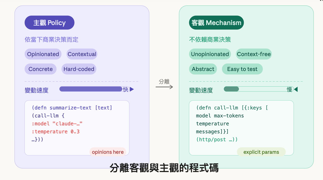 客觀的部分變動慢、邊界清晰,正是適合抽取成 library 的特徵。換句話說,持續重構讓 mechanism 浮現的過程,其實就是在為未來抽取 library 鋪路,也讓 LLM 更容易從穩定的結構裡辨識出可複用的 pattern。