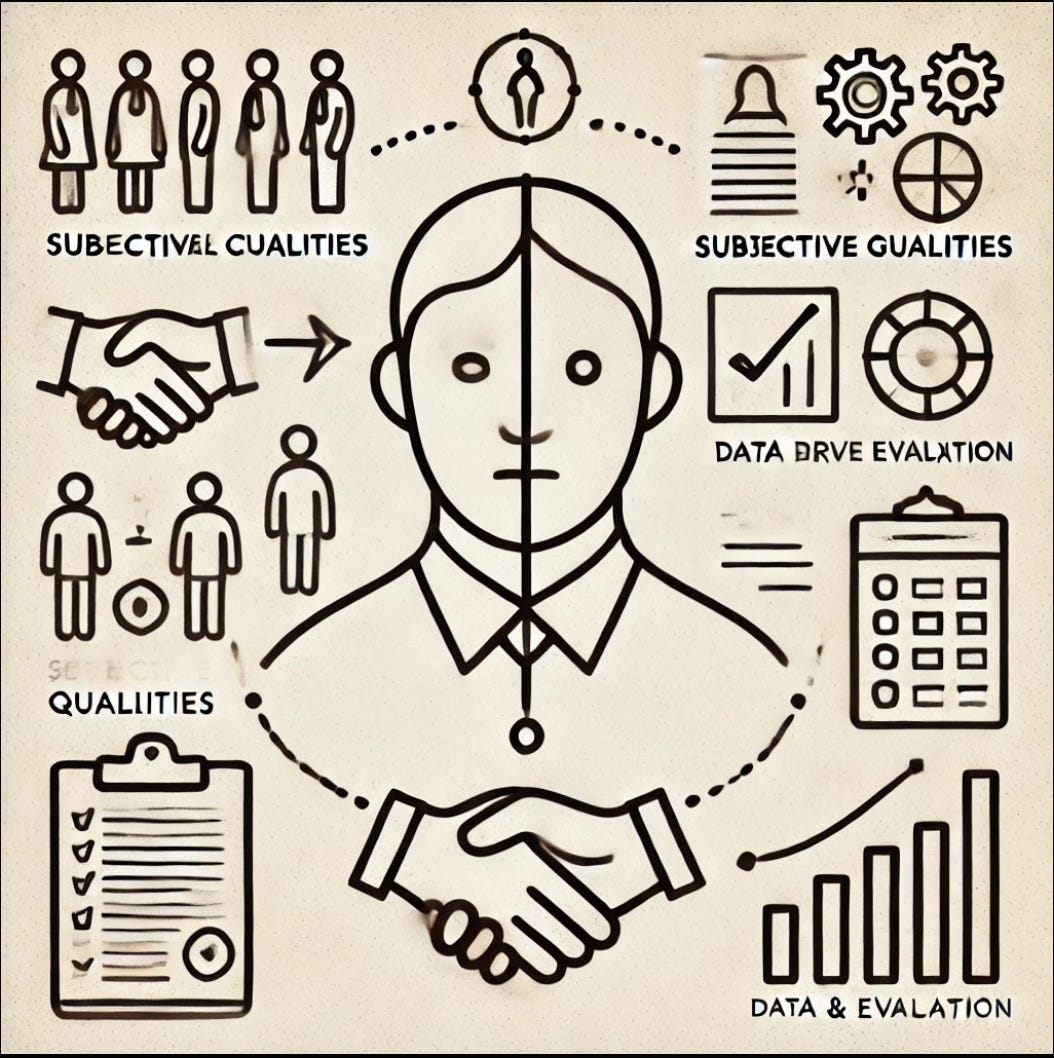 聽起來很合理,而我也相信,在上軌道的公司裡、某個層級以下的人事決策,要套用這樣子的決策方式不會太困難。層級低的工作,任務相對清楚,人選也多。評斷候選人的標準方面,在現代更是有許多基於資料應用的方式可以快速評估專業能力,比方說,英語能力檢定、軟體開發的白板考等等。