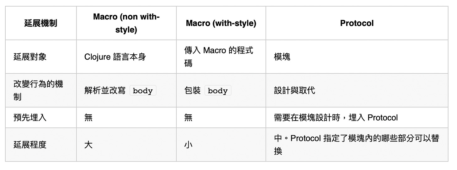 首先,Clojure 至少有兩種延展機制:Macro 與 Protocol 。當我們使用 Clojure 語言時,很多時候,我們並不會詳細地去區分 core syntax 與 core library functions 的分別。換言之,如果延展的部分是 core library functions ,這跟延展 core syntax ,對於之後的使用者的感受是幾乎一樣的。更具體地來講,Clojure 的 core library 裡有許多部分是用 Protocol/Interface 語法來建構的, Protocol/Interface 語法就是 core library 裡預設留下的延展點,所以 core library 的功能也是可以被延展的。