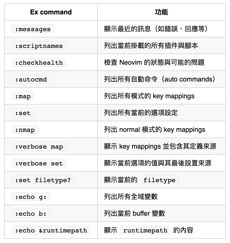 下方是個用來觀察狀態的 Ex command 列表。