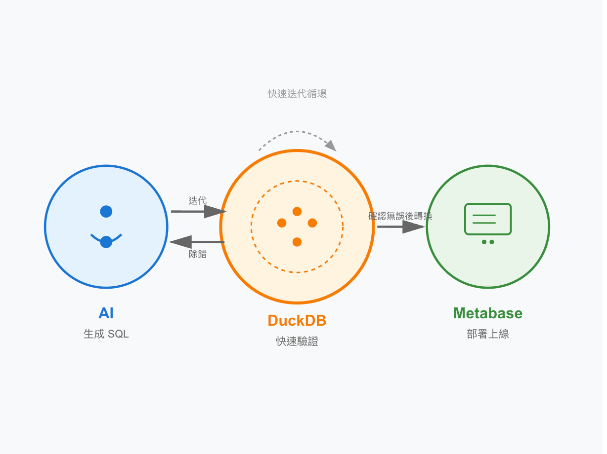 快速迭代:人不用在 Metabase UI 點來點去,AI 直接透過終端機操作 DuckDB。改一行測一次,幾秒鐘就知道結果。